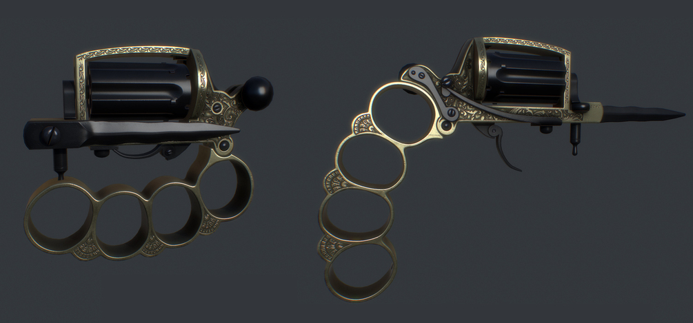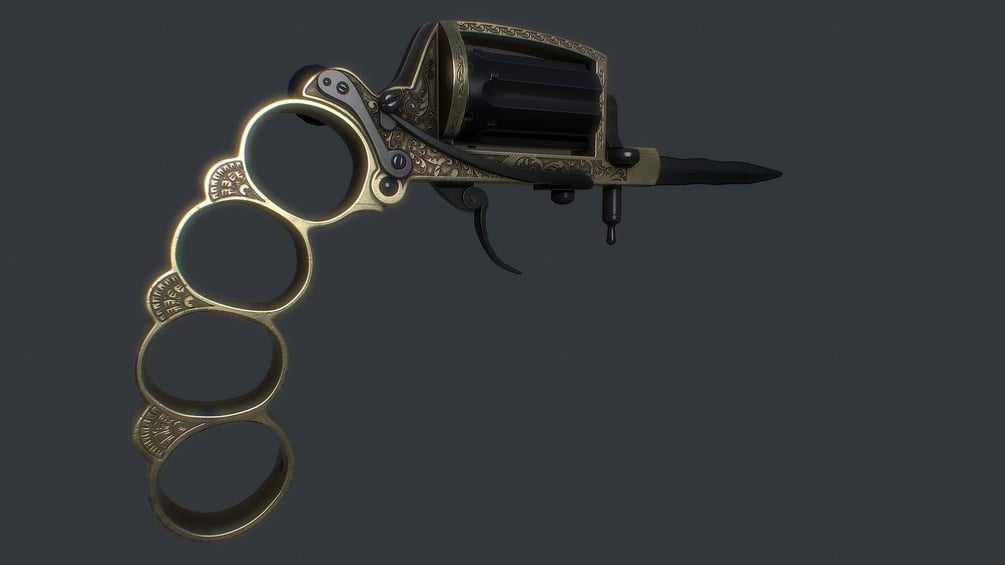 This is my take on an Apache pistol, The original design dates from the 1860s, the pistol was manufactured until the end of the 1800's. The Apache pistol operates on the principle of a pepperbox revolver using a pinfire cartridge and incorporates a fold-over knuckle duster forming the grip and also a rudimentary foldout, dual-edged knife.